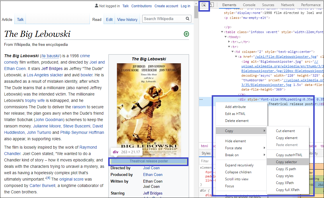 - Choose Copy XPath or Copy Selector from the copy submenu